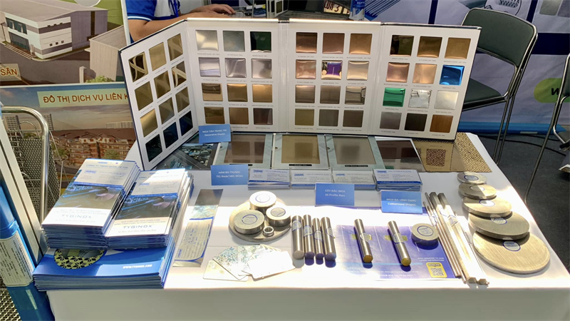 Gian hàng của TYGICO thu hút sự chú ý với các nguyên liệu thép không gỉ được sản xuất theo tiêu quốc tế ASTM, JIS, DIN, EN… theo công nghệ hiện đại, bao gồm: Cây đặc (láp) inox, tấm inox trang trí, inox đàn hồi dạng dây và dải băng, vật liệu hàn bù TIG/MIG,..
